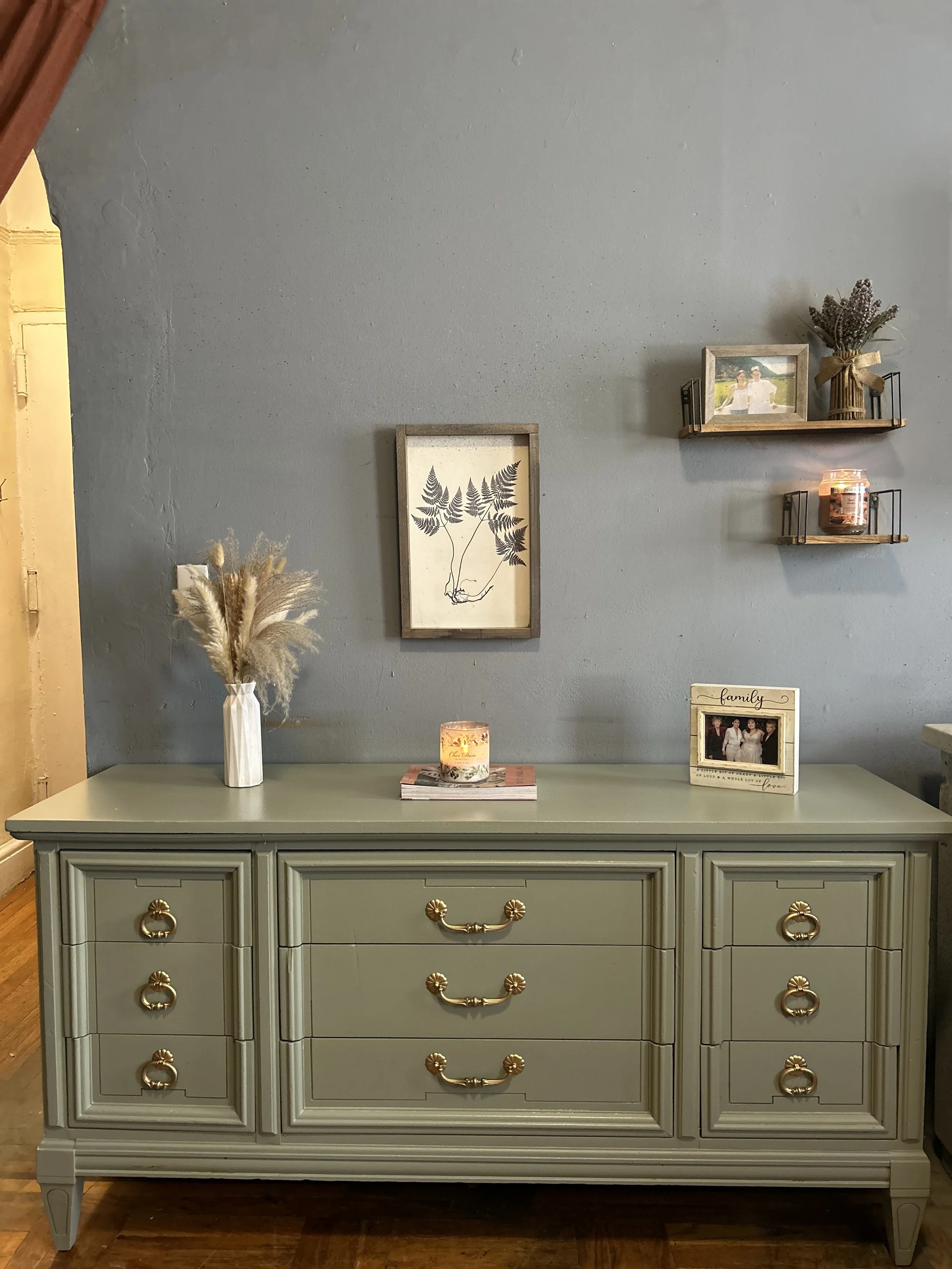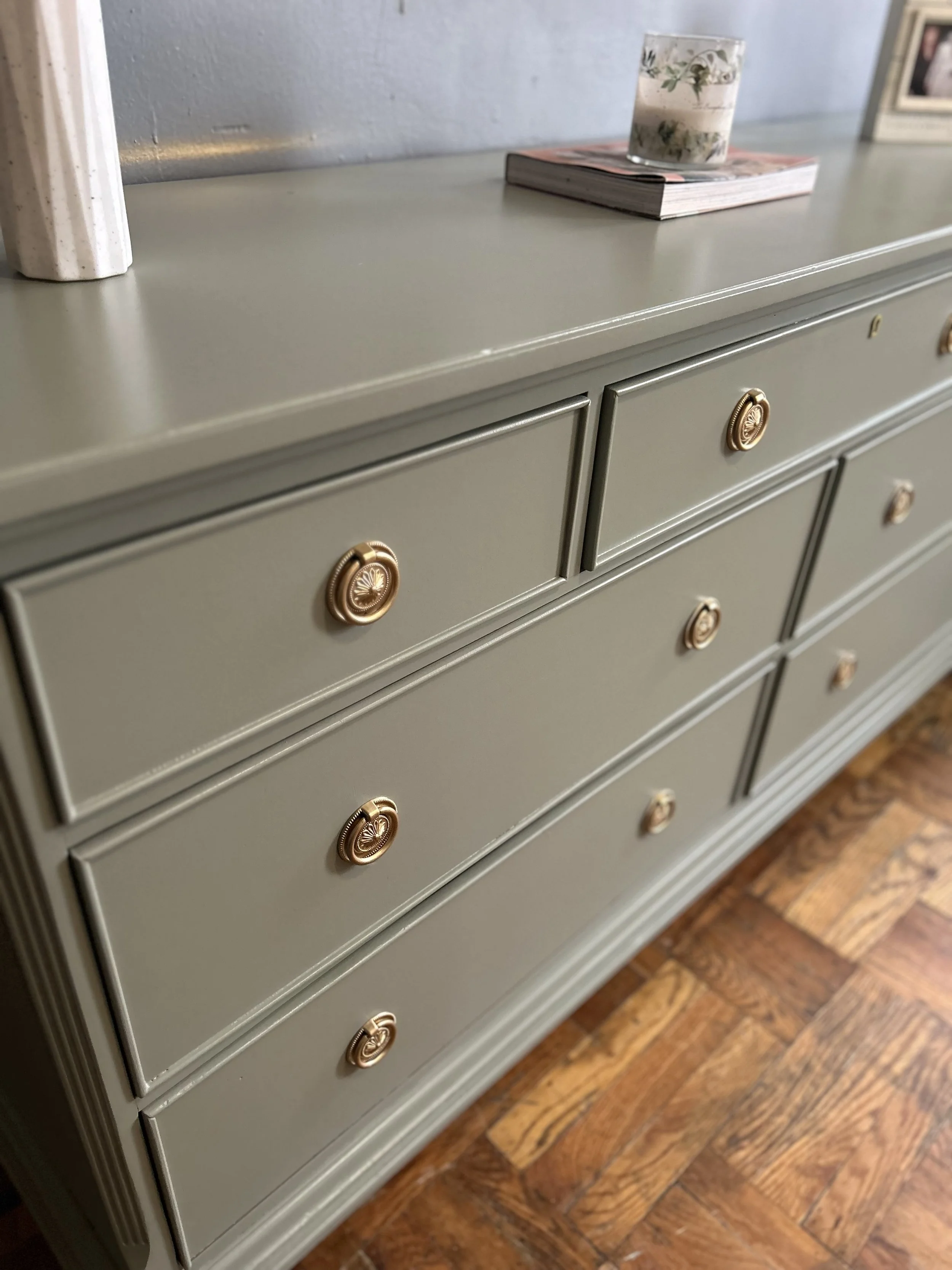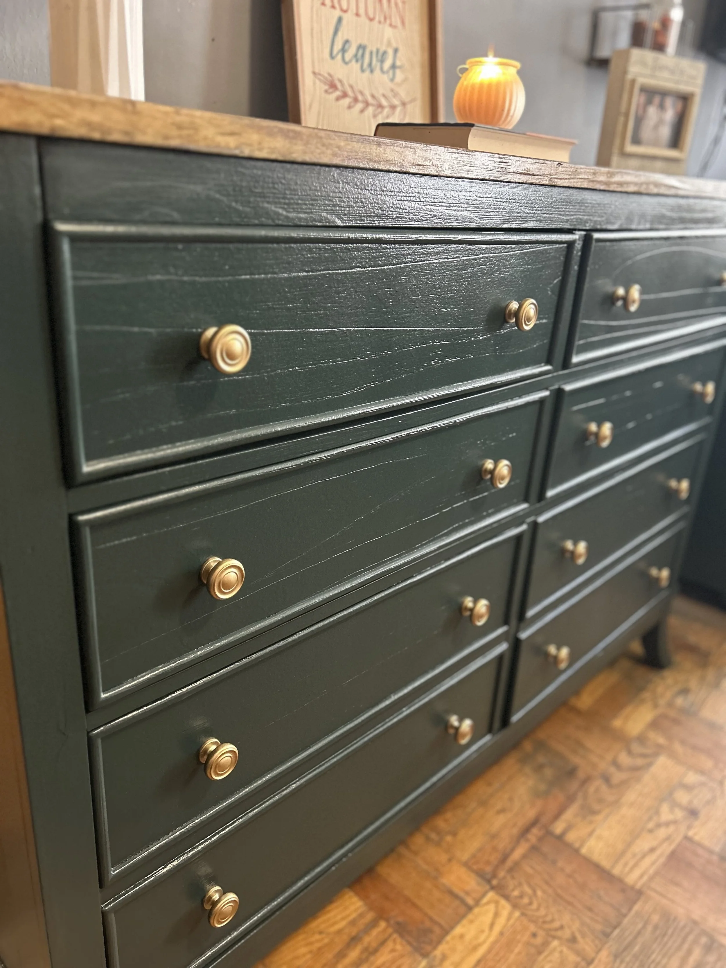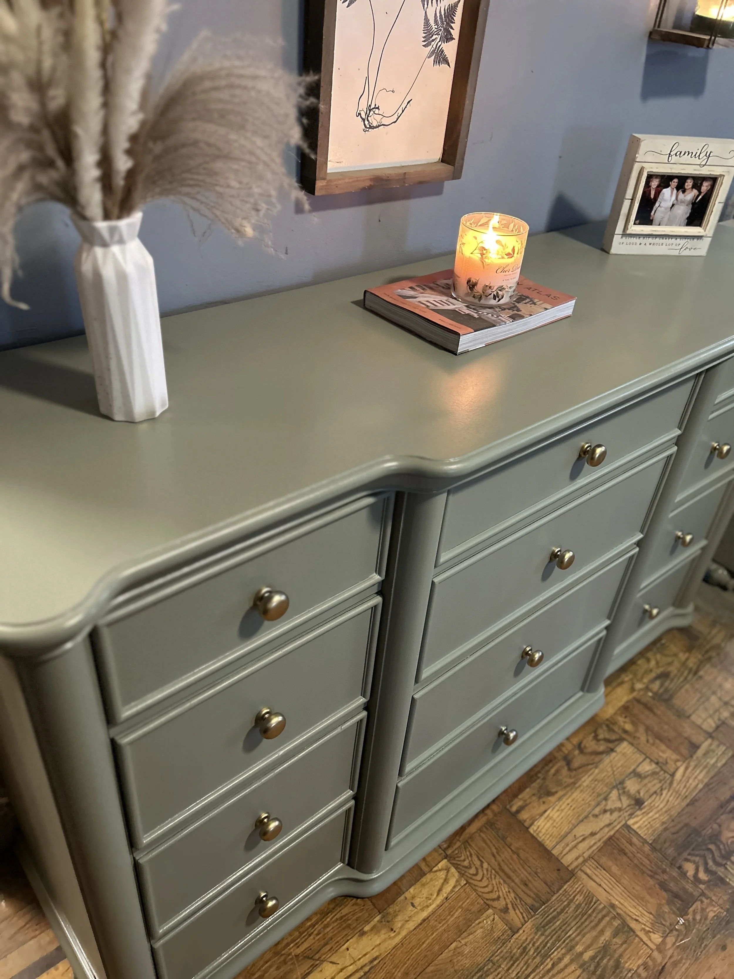 Earthy, timeless, and always ready to shine. This route saves sourcing time, allowing us to focus on what we do best: transforming pieces with finishes we know and trust. If you love soft greens, warm wood tones, and clean, minimal hardware, you’re in the right place.